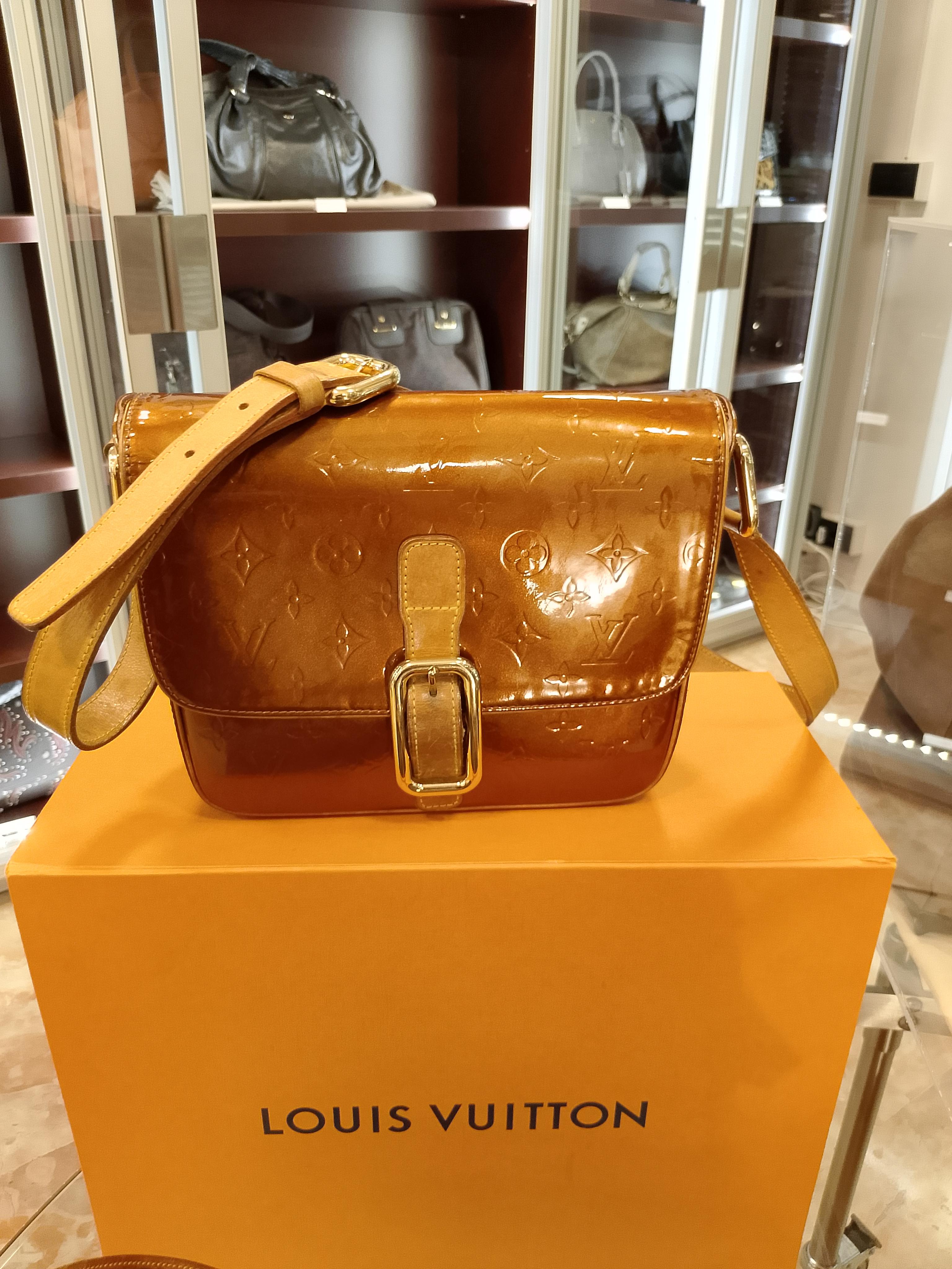 Borsa a tracolla Louis Vuitton Christie GM in pelle vernis marrone bronzo.