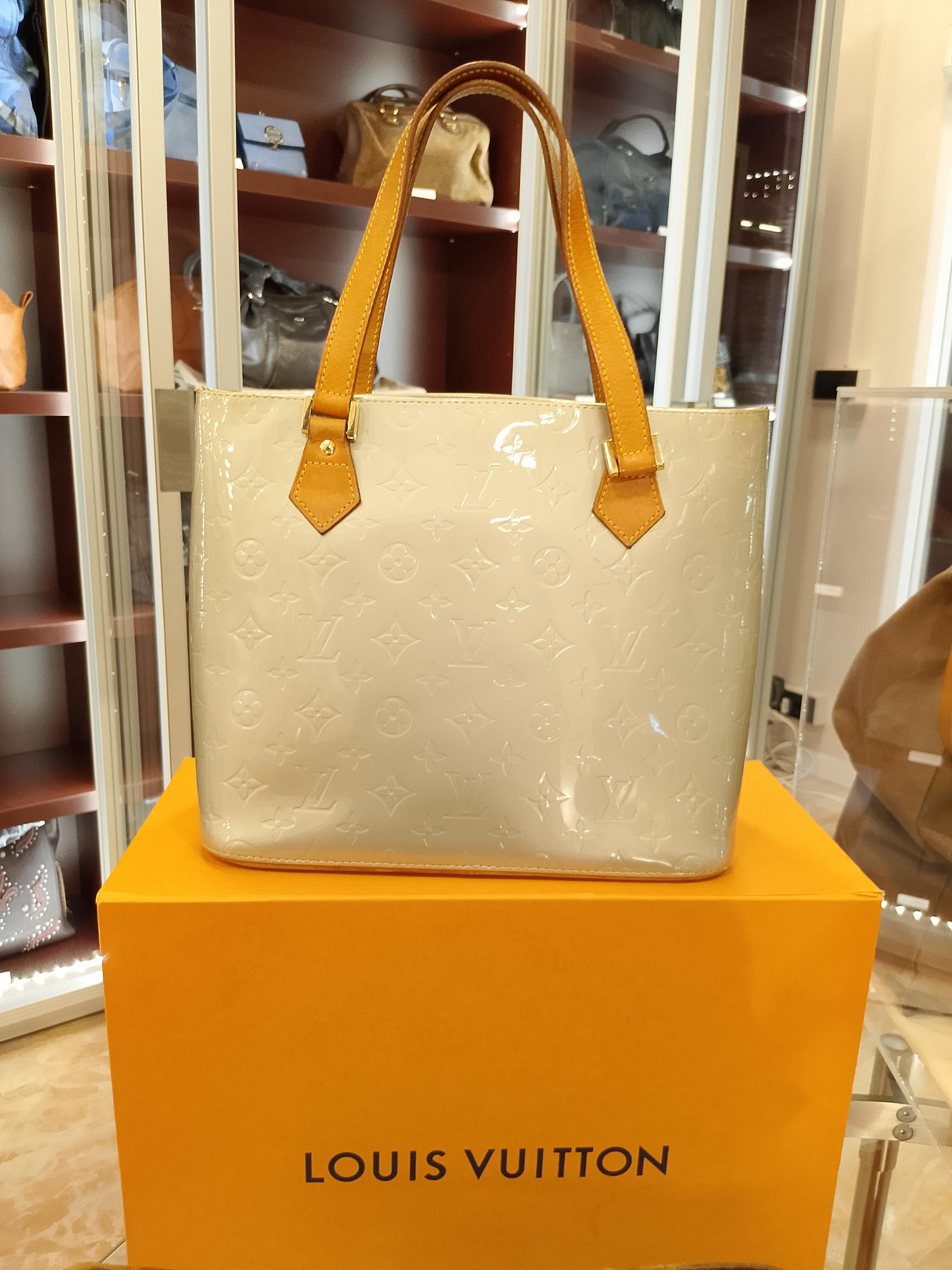 Borsa tote Louis Vuitton Houston in pelle verniciata monogram color celeste/grigio chiaro.